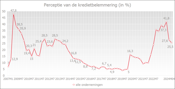 Results of the National Bank of Belgium's (NBB) quarterly survey on the perception of credit constraints among enterprises also indicate that banks would have eased their credit conditions slightly. The share of enterprises that perceived credit conditions as unfavourable stood at 25.5% in April 2024, down from 27.6% in January 2024.