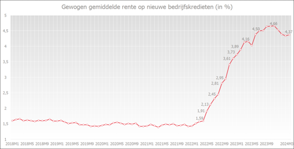 The weighted average interest rate on new business loans seems to have peaked at 4.66% in November 2023. In March 2024, that interest rate was still at 4.37%.