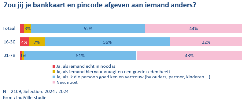 4% of the Belgian population would give his/her bank card with PIN to someone they do not know. Among young people, this share amounts to 11%. This is a slight improvement compared to last year (17%).