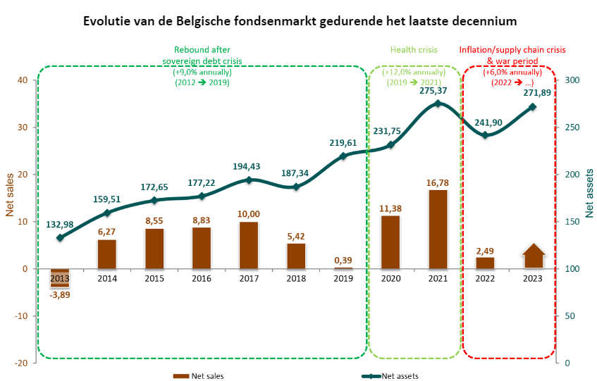 The evolution in 2023 of the Belgian funds market, which consists mainly of internationally diversified investment portfolios, cannot be separated from the global economic context and increased geopolitical tensions.