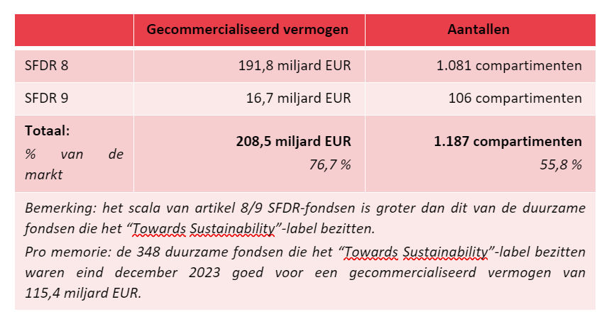 The table below gives an overview of the distribution of sustainable funds (according to the SFDR classification) in Belgium and this at the end of December 2023: