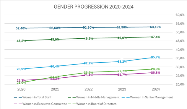 En 2024, les femmes ont été plus fortement représentées à tous les niveaux de direction. Pour la première fois, elles ont dépassé la barre des 35,7 % dans le management supérieur. Les départs dans ce groupe de femmes cadres ont également diminué, signe que l'attention particulière accordée à la rétention et à la culture porte ses fruits. Dans le management intermédiaire également, la proportion de femmes a continué d'augmenter pour atteindre 47,4 %, une évolution positive malgré la légère augmentation du nombre de départs volontaires dans ce groupe.