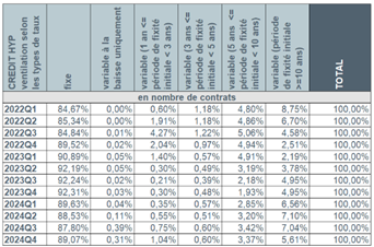 Au cours du quatrième trimestre 2024, plus de 9 emprunteurs sur 10 (94,7%) ont opté pour un taux d’intérêt fixe ou un taux d’intérêt variable assorti d’une période initiale de fixité des taux de minimum 10 ans. Environ 5% des emprunteurs ont privilégié un taux d’intérêt variable assorti d’une période initiale de fixité des taux entre 3 et 10 ans. Le nombre d’emprunteurs ayant choisi un taux variable annuellement s’est limité à 1,3%.