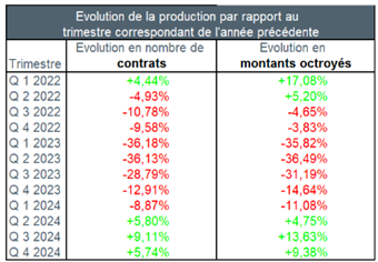 C’est une hausse de 9,4% pour le montant des crédits qui a été accordé au quatrième trimestre 2024 par rapport au quatrième trimestre de l’année précédente. Si l’on compare avec 2020 (-21%) et avec le quatrième trimestre exceptionnel de 2019 (-39,4%), on note une baisse plus conséquente.