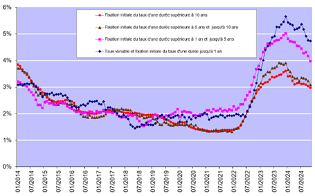 Le second semestre s’est, quant à lui, inscrit dans une tendance positive expliquée par la baisse des taux amorcée au début de l’année 2024. En effet, le second semestre enregistre, en montant, en excluant les refinancements, une hausse de l’ordre de 11,4 % par rapport à la même période en 2023. Le premier semestre 2024 avait, quant à lui, enregistré un recul de 3,1 % par rapport à 2023.