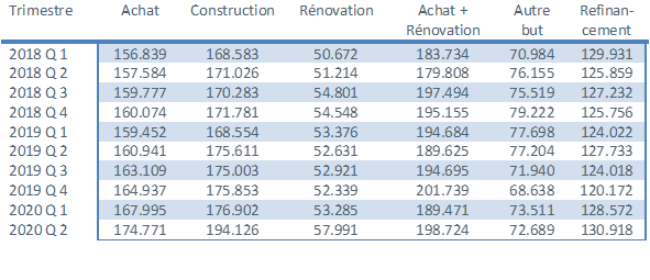 Le montant moyen d’un crédit pour l’achat d’un logement + rénovation a connu au deuxième trimestre 2020 une forte augmentation, pour atteindre 199.000 EUR.