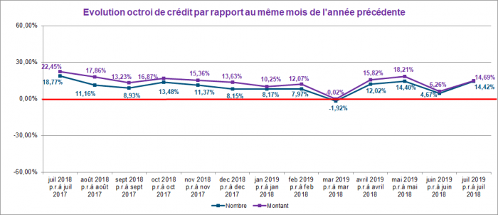 En juillet 2019, le nombre de demandes de crédit a augmenté de presque 20% par rapport à celui enregistré en juillet 2018. Le montant total correspondant à ces demandes a également augmenté de 21%. Ce même mois, le nombre de crédits octroyés a enregistré une augmentation de 14,5%. Le montant des crédits octroyés a quant à lui également augmenté de 14,5% par rapport à juillet 2018.