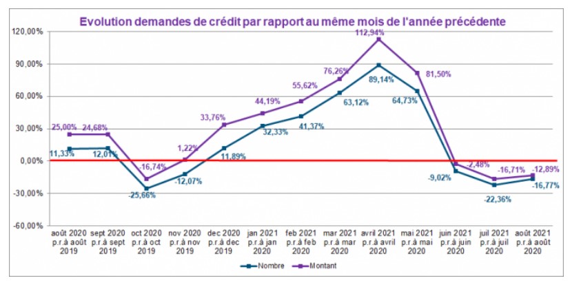 En août 2021, le nombre de demandes de crédit a diminué d’environ 17% par rapport à celui enregistré en août 2020. Le montant total correspondant à ces demandes a diminué de presque 13%