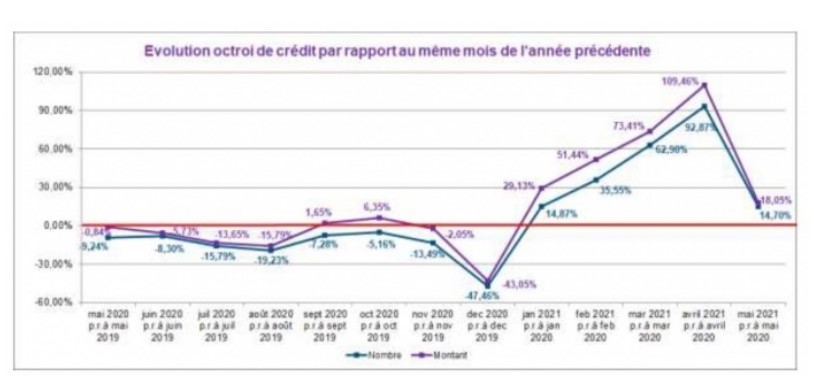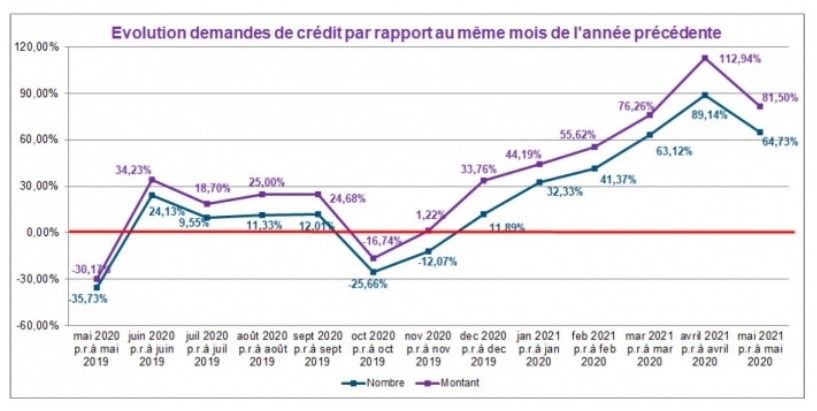 En mai 2021, le nombre de demandes de crédit a augmenté de presque 65% par rapport à celui enregistré en mai 2020. Le montant total correspondant à ces demandes a même augmenté de presque 81,5%.