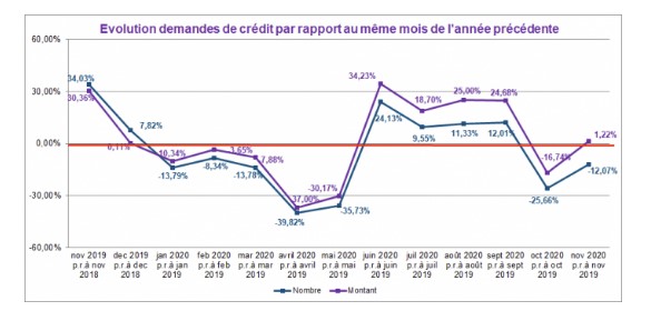 Le graphique ci-dessous rend compte de l'évolution des demandes de crédit, en nombre et en montant, pour les douze derniers mois. Les chiffres mensuels sont à chaque fois comparés avec ceux du même mois de l'année précédente.