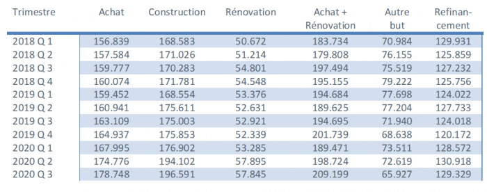 Le montant moyen d’un crédit de construction a continué à augmenter au troisième trimestre 2020 pour atteindre plus de 196.000 EUR. Ceci aussi représente une augmentation de plus de 28.000 EUR depuis début 2018.