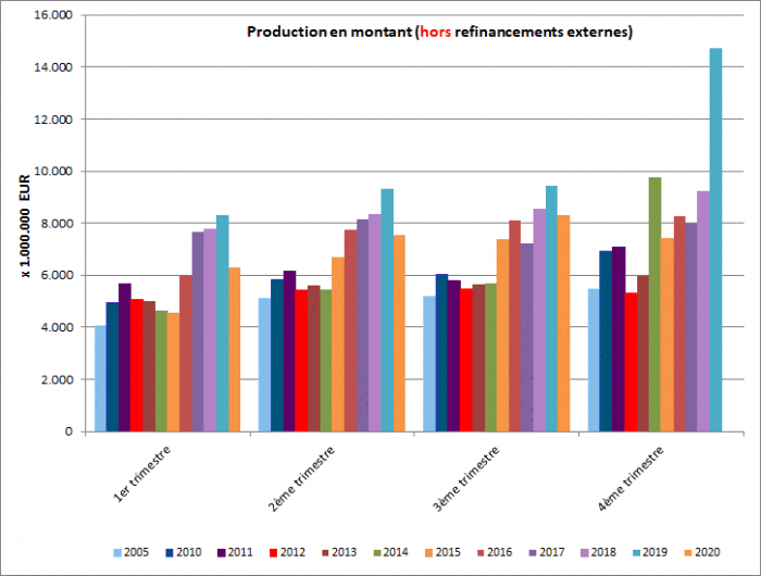 S’il est vrai que le montant total des crédits octroyés au troisième trimestre se situe donc sous le niveau du troisième trimestre de 2019, qui était une année de record absolu, il se rapproche cependant du niveau toujours très élevé de 2018.