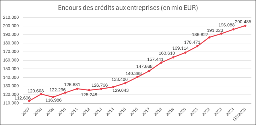 Fin juin 2025, l’encours des crédits aux entreprises avait augmenté de 3,8% par rapport à la même période de 2024 et dépassait pour la première fois le seuil des 200 milliards d’euros.