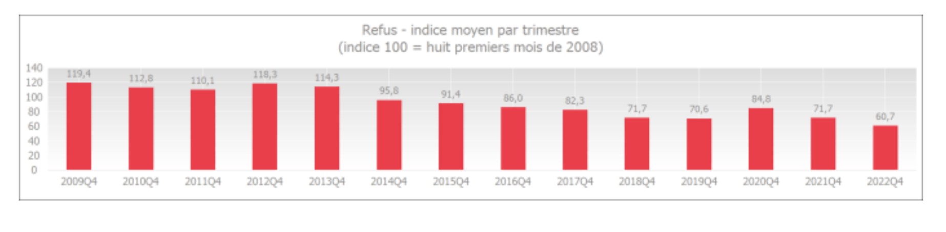 En pourcentage, les banques n'ont jamais refusé aussi peu de demandes de crédit durant un quatrième trimestre. Le degré de refus est donc à son plus bas niveau historique pour un quatrième trimestre.