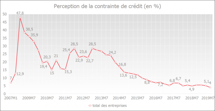 Les entreprises belges ont également indiqué dans l'enquête périodique de la BNB qu'elles rencontraient moins de freins au crédit. La perception des freins au crédit est historiquement faible. En avril 2019, 5,1 % des entreprises considéraient les conditions de crédit comme défavorables. En juillet 2019, ce taux était tombé à 4,0 %.