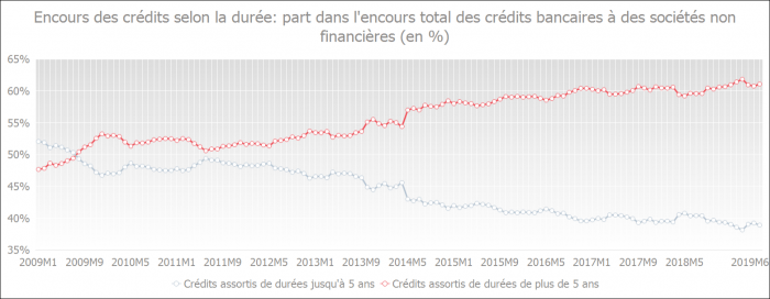L'encours des crédits aux entreprises a augmenté de 4 % entre mi-2018 et mi-2019. Avec 162,6 milliards d'euros, il a atteint un nouveau record fin juin 2019.