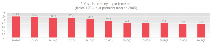 Le degré de refus au deuxième trimestre de 2019 se situait au même niveau qu'au deuxième trimestre de 2018. Par rapport à l'ensemble des deuxièmes trimestres, il s'agit du niveau le plus bas depuis 2009.