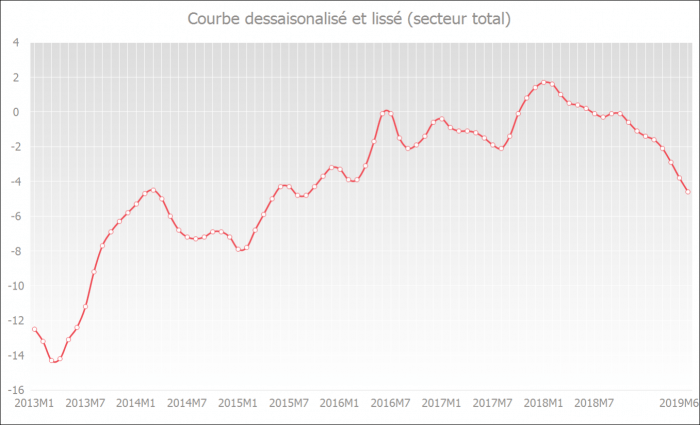 La courbe désaisonnalisée et lissée reflète la tendance conjoncturelle sous-jacente. Une courbe descendante indique un affaiblissement de la confiance des entreprises.