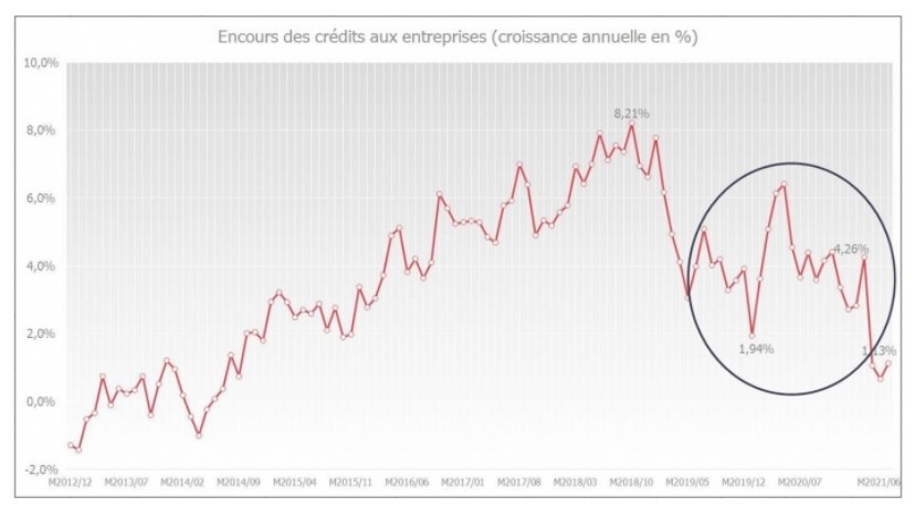 Sur une base annuelle (en comparant juin 2020 à juin 2021), l'encours a augmenté de 1,1 %. En 2020, le taux de croissance annuel était de 3,4 %.