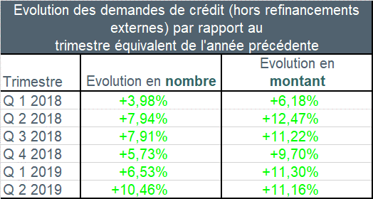 Le nombre de demandes de crédit a connu au deuxième trimestre 2019 une augmentation de 10,5 %, hors refinancements, par rapport au même trimestre de l’année précédente. Le montant de crédit correspondant a également connu une hausse, de 11,2 % précisément.