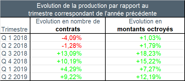 Au cours du deuxième trimestre de 2019, le nombre de crédits octroyés, hors refinancements externes, a connu une croissance d’un peu plus de 9 % par rapport au deuxième trimestre 2018. Le montant correspondant a augmenté d’un peu plus de 12 %.