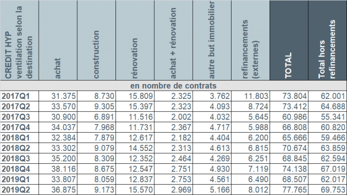 Comparativement au deuxième trimestre de 2018, le nombre de crédits contractés pour l’achat avec transformation a enregistré l’augmentation la plus élevée en pourcentage, à savoir +28 % ou 652 contrats en plus. Le nombre de contrats de crédit pour l’achat d’un logement (+3.573) a progressé au deuxième trimestre 2019 de 10,7 % par rapport au deuxième trimestre de 2018. Le nombre de crédits pour la rénovation d’un logement (+1.018) a augmenté de 7 %, tout comme le nombre de crédits de construction (+94), qui a connu une croissance de 1%. Le nombre de crédits pour d’autres buts (+553) a quant à lui fait un bond en avant de 12 %.