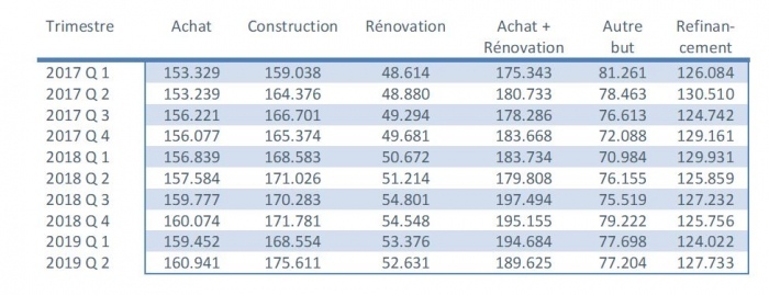 Le montant moyen emprunté pour l’achat d’un logement a légèrement augmenté au cours du deuxième trimestre 2019 pour atteindre 161.000 EUR.