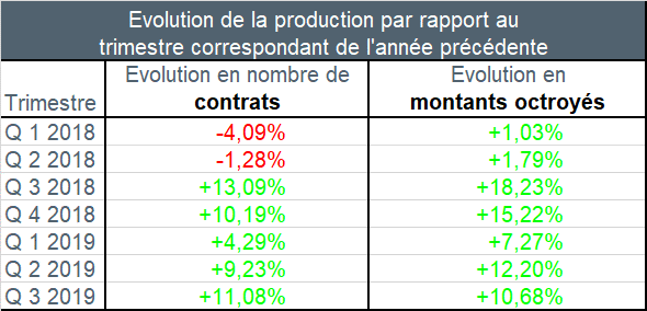 Au cours du troisième trimestre de 2019, le nombre de crédits octroyés, hors refinancements externes, a connu une croissance d’un peu plus de 11% par rapport au troisième trimestre 2018. Le montant correspondant a augmenté de 10,7%.
