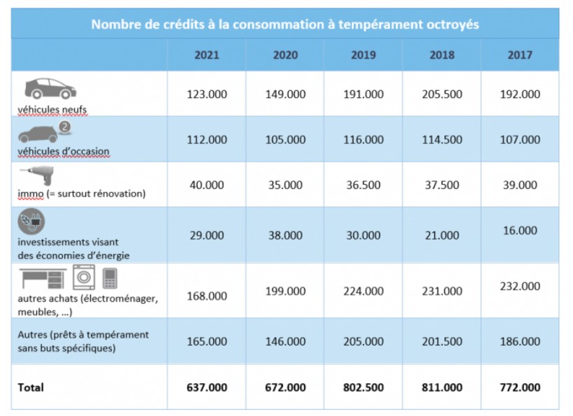 Selon la Centrale des crédits aux particuliers de la Banque Nationale de Belgique et concernant les crédits aux particuliers (hypothécaires et à la consommation) : « en dépit de la crise de la COVID‑19, le nombre d’arriérés a reculé pour la cinquième année consécutive ». Plus précisément, nombre de crédit à la consommation à tempérament défaillant à diminué -5% par rapport à 2020 et de -9% par rapport à 2019.