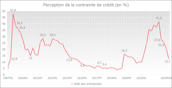 Les résultats de l'enquête trimestrielle de la Banque nationale de Belgique (BNB) sur la perception des contraintes de crédit par les entreprises indiquent que les banques auraient légèrement assoupli leurs conditions de crédit. La part des entreprises percevant les conditions de crédit comme défavorables s'élevait à 12,7% en octobre 2024, contre encore 20,7% en juillet 2024.