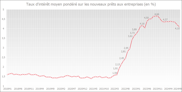 Le taux d'intérêt moyen pondéré sur les nouveaux crédits aux entreprises a atteint un pic de 4,66 % en novembre 2023. En septembre 2024, ce taux d'intérêt était déjà redescendu à 4,10%.