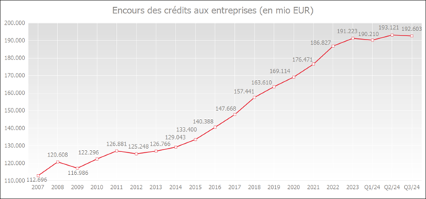 L'encours des crédits aux entreprises à fin septembre 2024 est en hausse de 2,0 % par rapport à l'année précédente, atteignant 192,6 milliards d'euros.