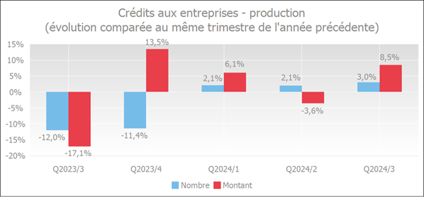 Le nombre de crédits accordés a lui aussi progressé. Ainsi fin septembre 2024, on notait 3,0 % de crédits accordés de plus qu’au cours du même trimestre de l'année précédente, la progression des montants octroyés étant de 8,5%.