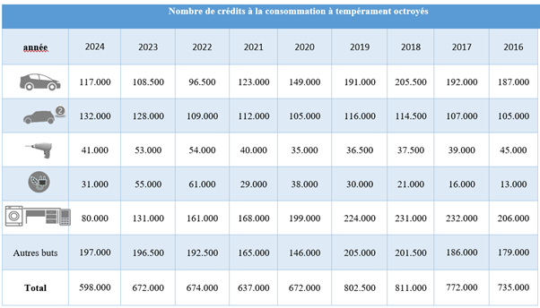 Il est à noter également que la rénovation générale, hors rénovation écoénergétique, est également à la baisse en 2024. En effet, 41.000 crédits à consommation à but « rénovation » pour un montant de près de 790 millions d’euros ont été réalisés au cours de l’année 2024, soit une baisse de 23 % en nombre, et une baisse de 12,1 % en montant par rapport à la même période de l’année précédente.