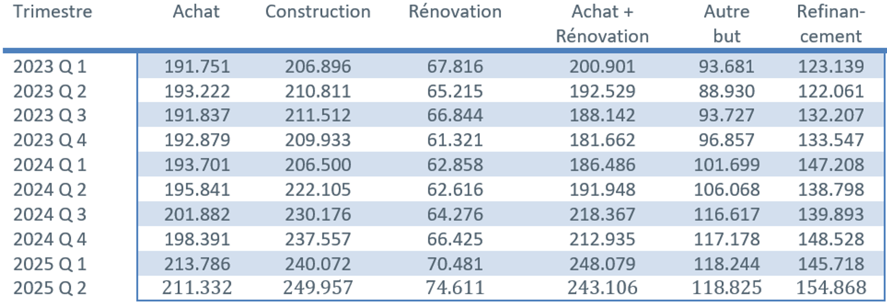Au deuxième trimestre 2025, un peu moins de 55.000 contrats de crédit hypothécaire ont été conclus pour un montant total d’environ 10 milliards EUR (hors refinancements).