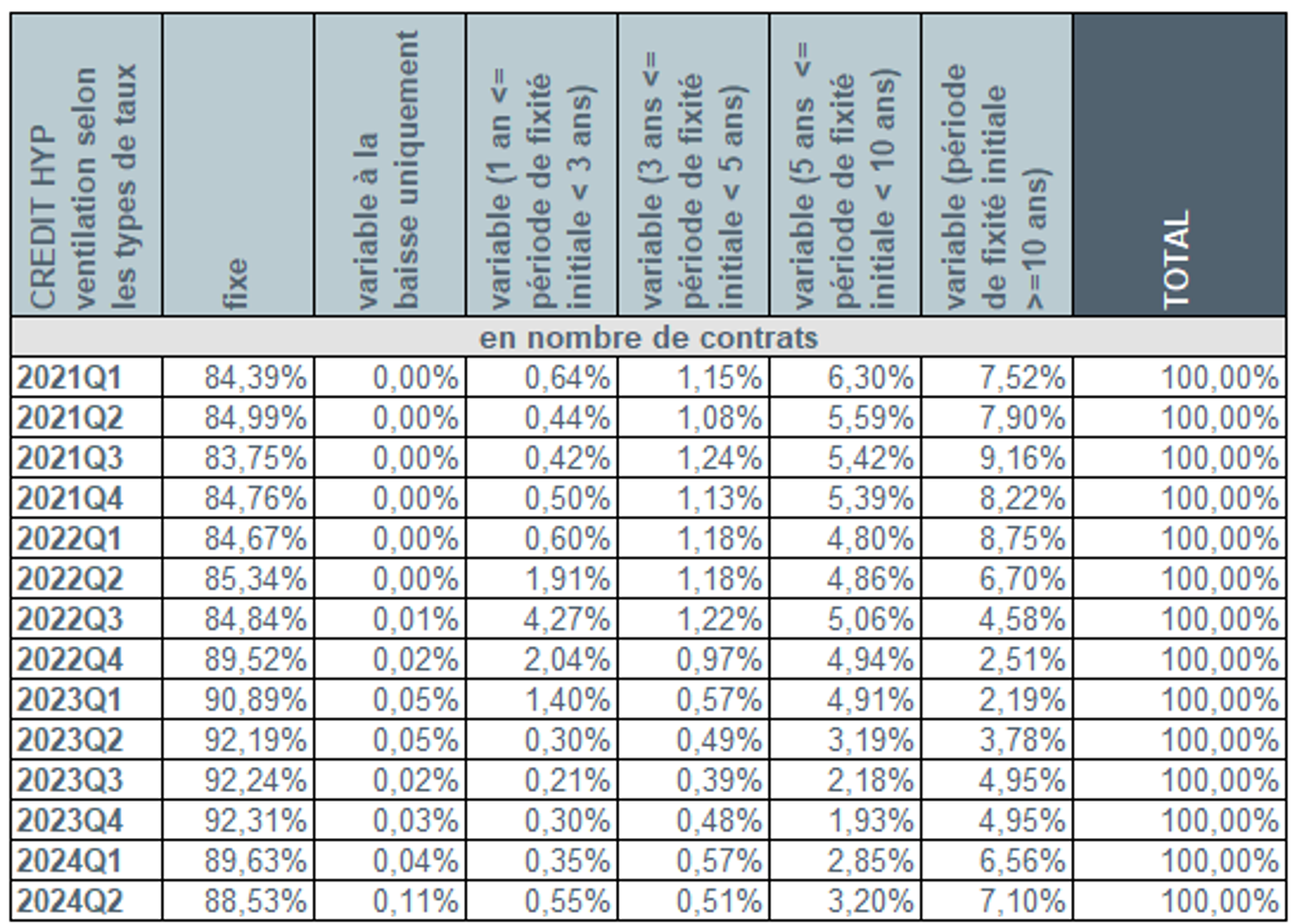 Au cours de ce trimestre, environ 96% des emprunteurs ont à nouveau opté pour un taux d’intérêt fixe ou un taux d’intérêt variable assorti d’une période initiale de fixité des taux de minimum 10 ans. Dans à peine 0,5% des cas, les emprunteurs ont encore opté pour des crédits assortis d’un taux d’intérêt variable annuellement.