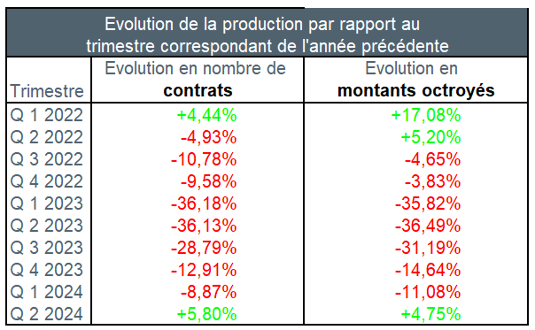 Au cours du deuxième trimestre de 2024, le nombre de crédits octroyés, hors refinancements externes, a connu une augmentation de presque 6% par rapport au deuxième trimestre 2023 après 8 trimestres consécutifs de baisse. Le montant correspondant a, quant à lui, également enregistré une hausse d’environ 4,8%.