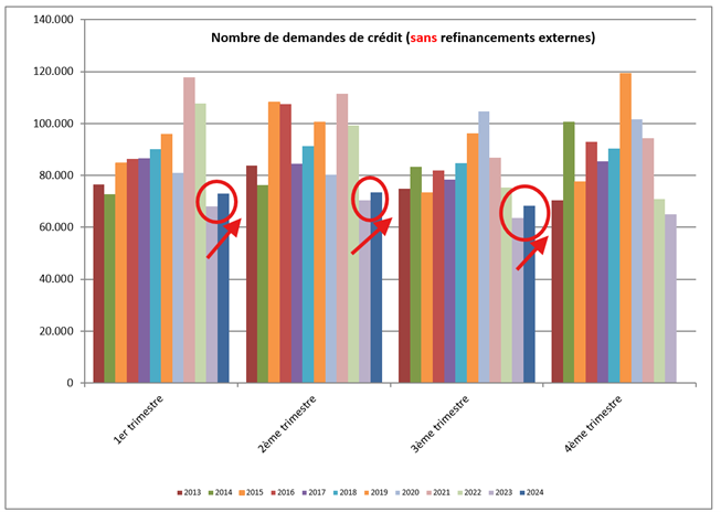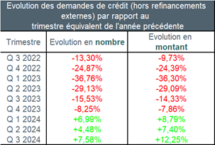 Du troisième trimestre 2023 au troisième trimestre de 2024, le nombre de demandes de crédit a augmenté d’environ 7,5%, hors refinancements. Le montant de crédit correspondant durant ce troisième trimestre 2024 a également augmenté d’environ 12%.