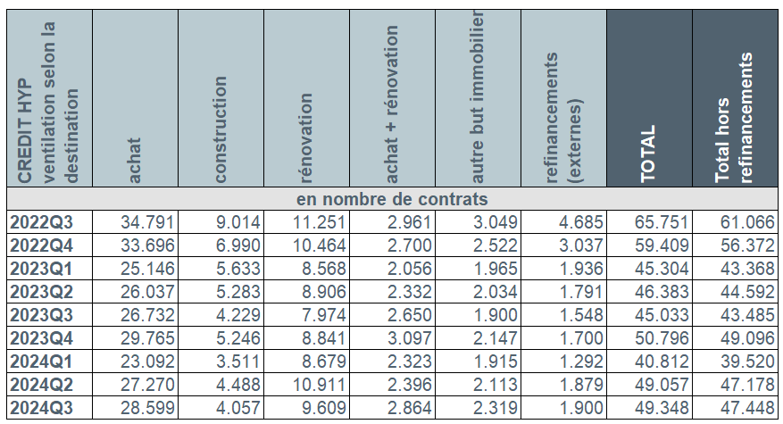 Comparativement au troisième trimestre de 2023, le nombre de crédits contractés pour les autres destinations (+419, soit +22%) et le nombre de crédits contractés pour la rénovation d’un logement (+1.635, soit +20,5%) ont connu une forte augmentation. Le nombre de crédits pour l’achat avec transformation (+214, soit +8,1%) ainsi que le nombre de contrats de crédit pour l’achat d’un logement (+1.867, soit +6,98%) ont également connu une augmentation. Le nombre de crédits pour la construction d’un logement (‑172) a signé une diminution de -4%.