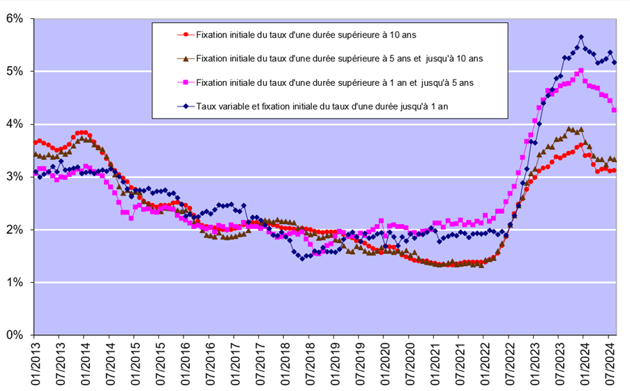 Au cours du troisième trimestre 2024, la grande majorité des emprunteurs (95 %) ont encore opté pour un taux d’intérêt fixe ou un taux d’intérêt variable assorti d’une période initiale de fixité des taux de minimum 10 ans. Dans, à peine, 0,8% des cas, les emprunteurs ont opté pour des crédits assortis d’un taux d’intérêt variable annuellement.