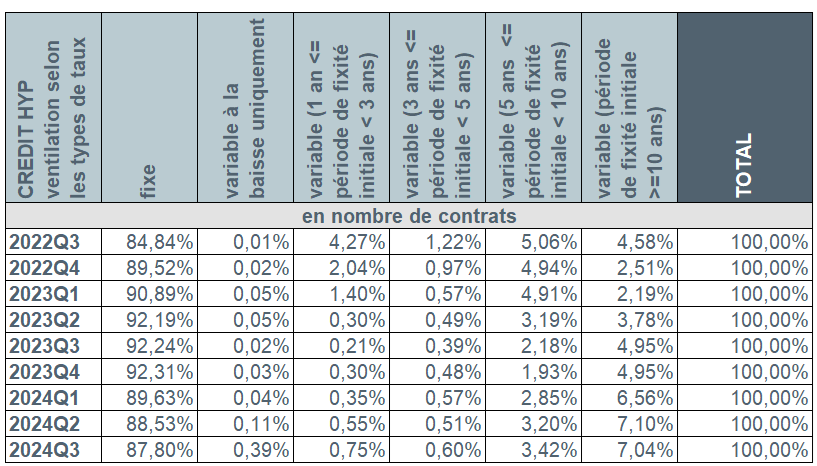 Au cours du troisième trimestre 2024, plus de 9 emprunteurs sur 10, plus précisément 95%, ont à nouveau opté pour un taux d’intérêt fixe ou un taux d’intérêt variable assorti d’une période initiale de fixité des taux de minimum 10 ans. Environ 4% des emprunteurs ont privilégié un taux d’intérêt variable assorti d’une période initiale de fixité des taux entre 3 et 10 ans. Moins de 1% des emprunteurs ont choisi un taux variable annuellement.