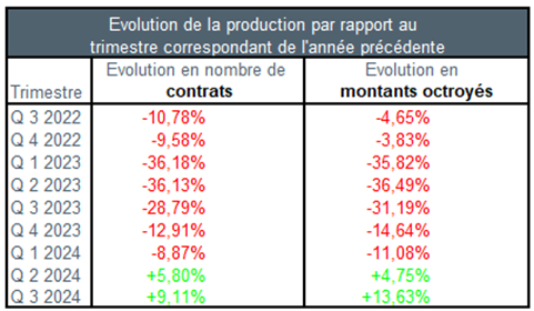 Sur la voie du 2e trimestre de 2024, au cours du troisième trimestre de 2024, le nombre de crédits octroyés, hors refinancements externes, a également connu une augmentation d’environ 9 % par rapport au troisième trimestre 2023. Le montant correspondant a quant à lui aussi enregistré une hausse d’environ 14%.