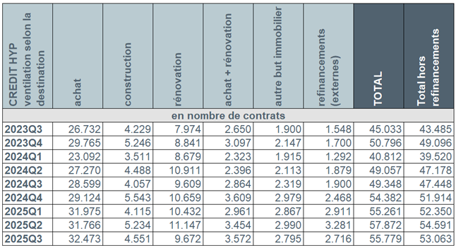 Au troisième trimestre 2025, environ 53.100 contrats de crédit hypothécaire ont été conclus pour un montant total de quelque 10,1 milliards EUR (hors refinancements).