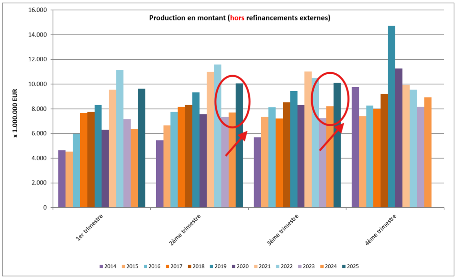 Au troisième trimestre 2025, environ 53.000 nouveaux crédits ont été octroyés pour un montant total d’un peu plus de 10,1 milliards EUR – hors refinancements externes. Cela confirme la tendance positive de la production des crédits hypothécaires pour l’année 2025.