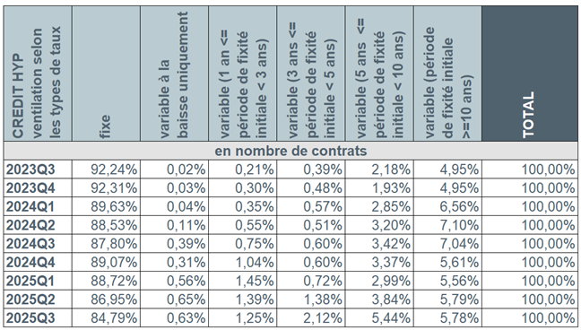 Au cours du troisième trimestre 2025, la grande majorité des emprunteurs (90,6 %) ont encore opté pour un taux d’intérêt fixe ou un taux d’intérêt variable assorti d’une période initiale de fixité des taux de minimum 10 ans. Dans à peine 1,9% des cas, les emprunteurs ont opté pour des crédits assortis d’un taux d’intérêt variable annuellement.