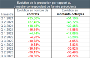 Comme durant les trimestres précédents, au cours du troisième trimestre de 2023, le nombre de crédits octroyés, hors refinancements externes, a également connu une diminution d’environ 29% par rapport au troisième trimestre 2022. Le montant correspondant a quant à lui aussi enregistré une baisse d’environ 31%.
