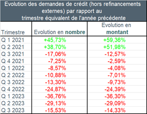 Du troisième trimestre 2022 au troisième trimestre de 2023, le nombre de demandes de crédit s’est réduit d’environ 15,5%, hors refinancements. Le montant de crédit correspondant durant ce troisième trimestre 2023 s’est également contracté, d’environ 14,5%.