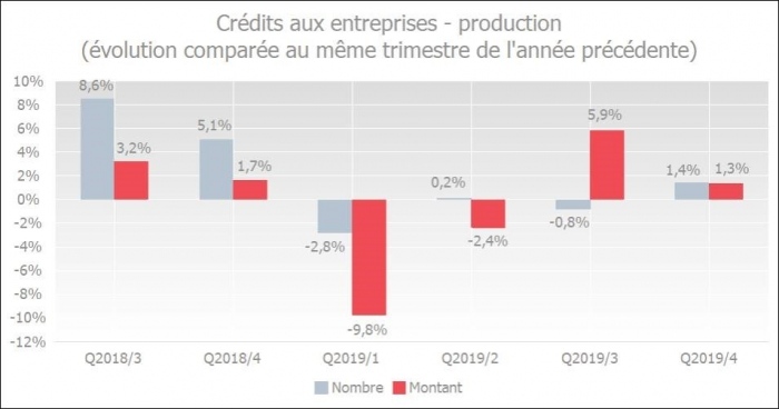 Malgré la baisse de la demande de crédit, les banques ont octroyé davantage de nouveaux crédits. Bien sûr, la demande de crédit des entreprises et l'octroi de crédit par les banques ne sont pas parfaitement synchrones. Il existe ainsi toujours un décalage dans le temps. Lorsque l'on cumule les chiffres des quatre trimestres de 2019 et qu'on les compare à ceux de 2018, on constate une diminution tant en nombre qu’en montant, à savoir de -0,5 % et -1,8 %.