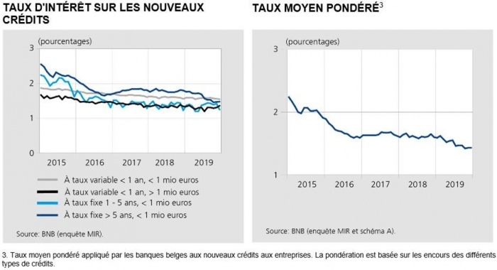 Selon les données de la BNB, le taux d'intérêt moyen pondéré sur les nouveaux crédits aux entreprises en décembre 2019 est resté au même niveau qu'en novembre 2019, soit un taux historiquement bas de 1,43 %.