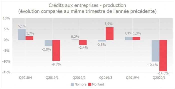 Au premier trimestre de 2020, la demande de crédits par les entrepreneurs s’est contractée de 10,5 % par rapport à la même période de l'année précédente. En termes de montant, le repli a été plus important encore, avec 15,4%.